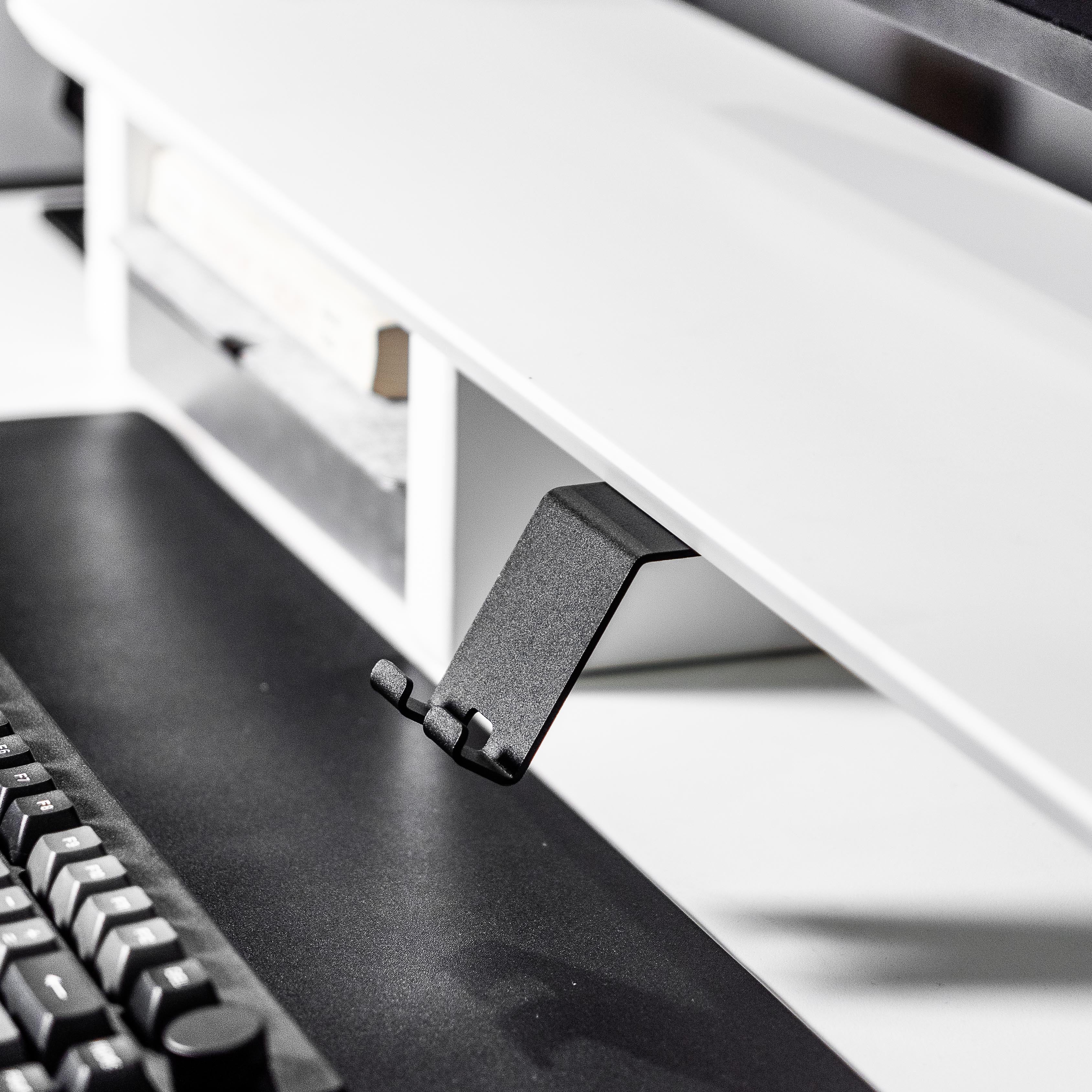 This phone/tablet holder is compatible with devices up to 1.4cm / 0.55" thick. With our innovative rail mount system, you have unlimited option to place your tablet on our v2.0 desk shelf track — without having to remove the tablet holder completely.